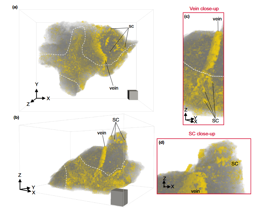 Sample A0159 (in gray) contains numerous dolomite carbonate detections (in yellow), primarily forming a vein that extends across almost the entire sample.